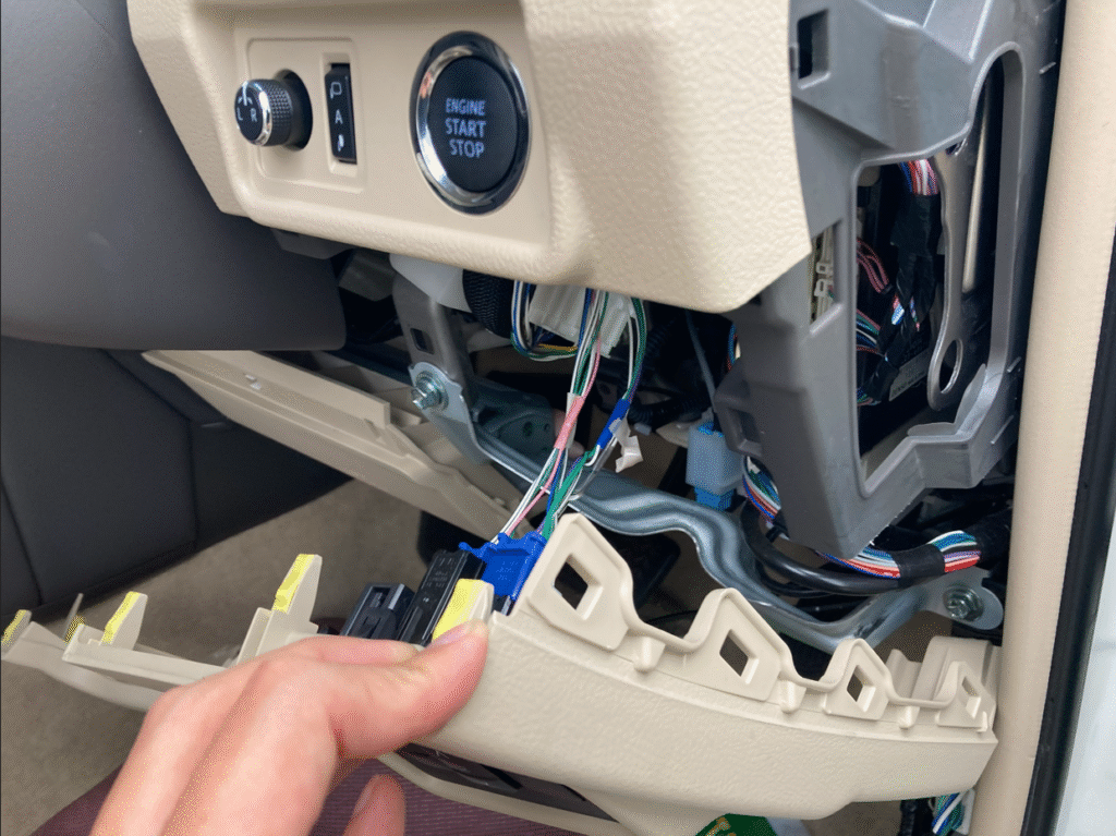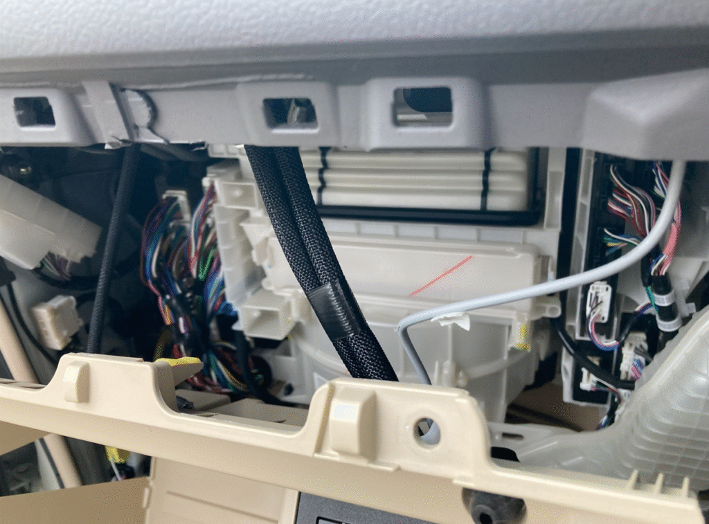 特に運転席側はスペースが限られるため、配線ミスがないよう確実に処理します。